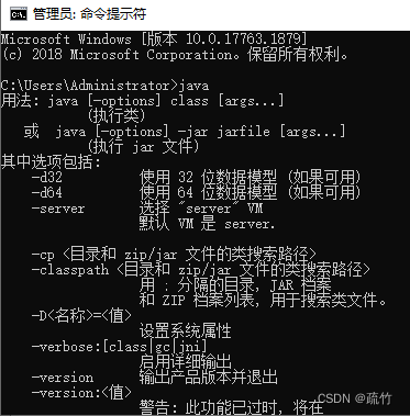在提示符后输入java或javac命令。如果显示如下图,表示配置正确;如果显示“'java' 不是内部或外部命令,也不是可运行的程序或批处理文件。”,则表示配置不正确,需重新检查Path环境变量