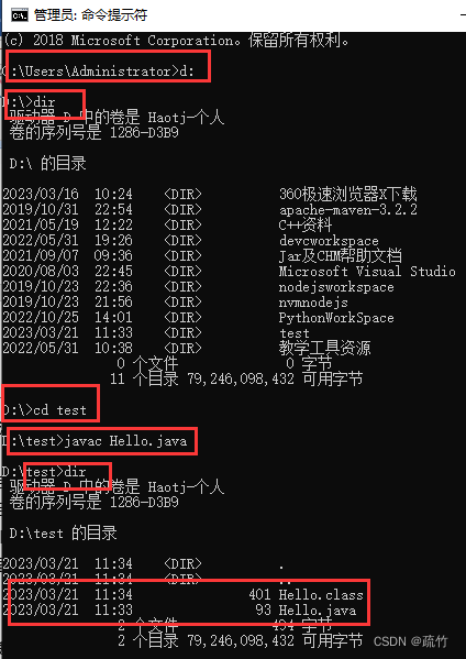第一步:d盘下新建一个test文件夹,在test文件夹中新建一个.txt文件,修改文件名为Hello.java