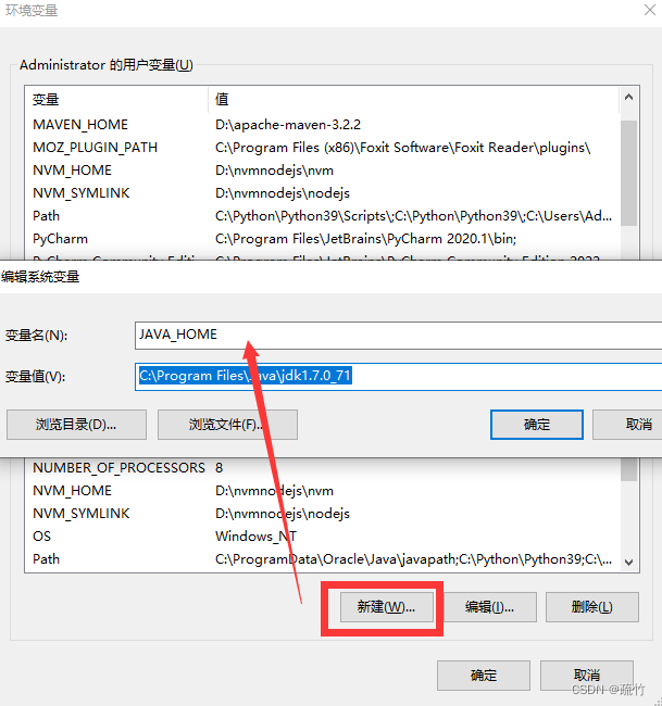 JAVA_HOME:点击新建,在弹出的对话框,输入对应信息。