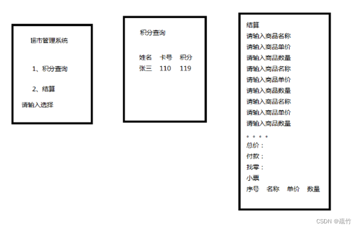 System.out.print("1、积分查询");
