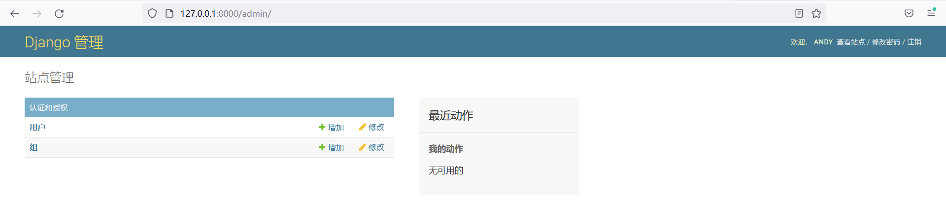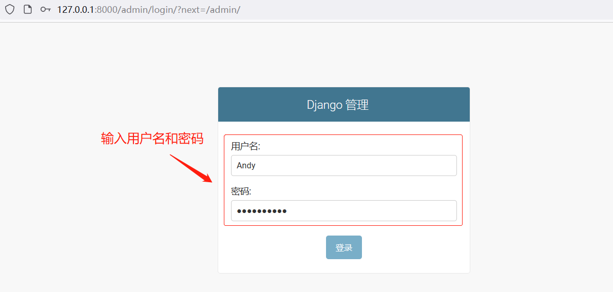 启动服务,在浏览器中输入网址http://127.0.0.1:8000/admin/