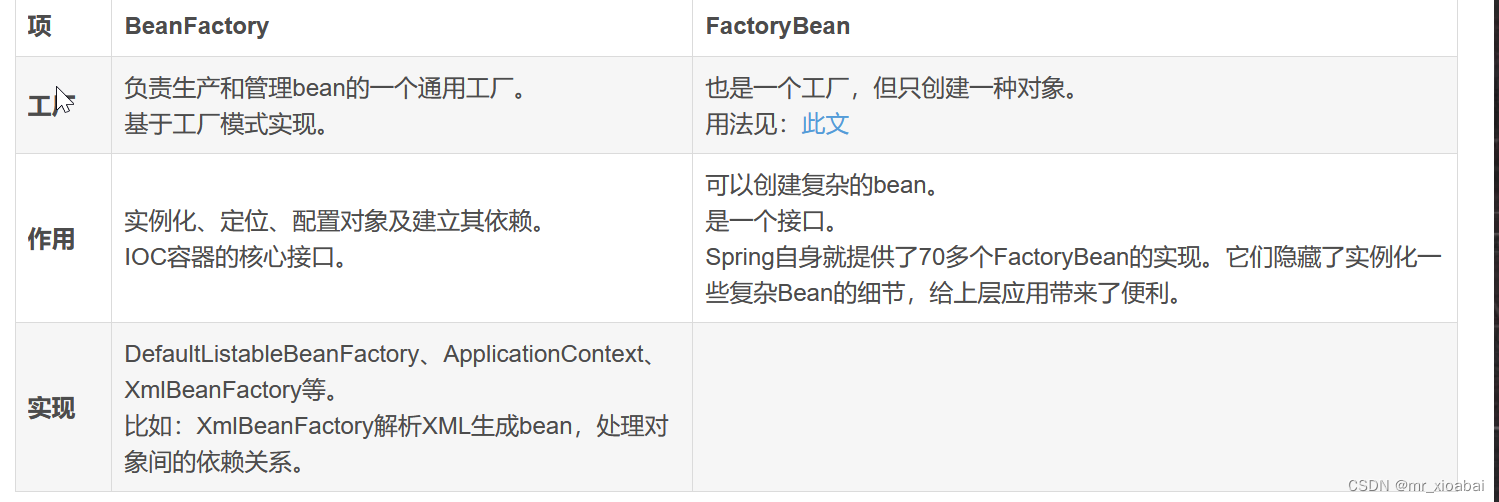 1.BeanFactory接口本文介绍Spring里的BeanFactory。包括:BeanFactory 和 FactoryBean的ApplicationContext的委托。Spring的本质是一个bean工厂(beanFactory)或者说bean容器,它按照我们的要求,生产我们需要的各种各样的bean,提供给我们使用。只是在生产bean的过程中,需要解决bean之间的依赖问题,才引入了依