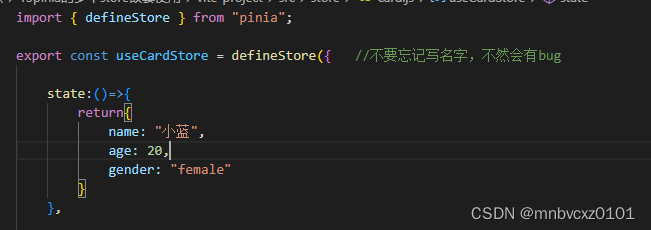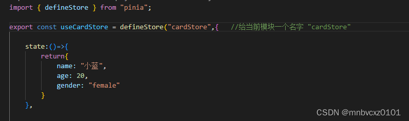 给当前的cardStore.js模块的defineStore传入一个名字“cardStore”:如图所示
