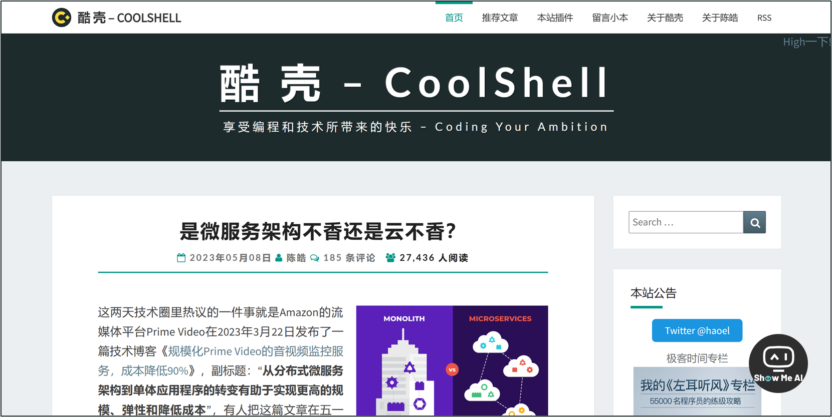 CoolShell 是陈皓创建的技术共享平台,主题非常广泛,既包含了Go语言、C语言、Linux、人工智能等技术话题,也有他分享的见闻、知识、心得、趣闻等。在将近20年的时间里,营造了在轻松氛围下享受编程和技术点点滴滴的程序员落脚点。