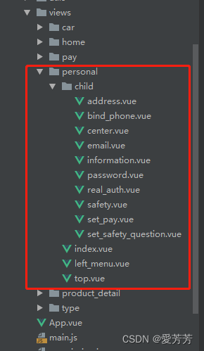 个人中心所有页面单独存放在personal目录下,top.vue为通用顶部组件页面,left_menu.vue作为左侧菜单栏组件页面,index.vue为总体布局主页面,child目录专门存放个人中心具体功能子页面