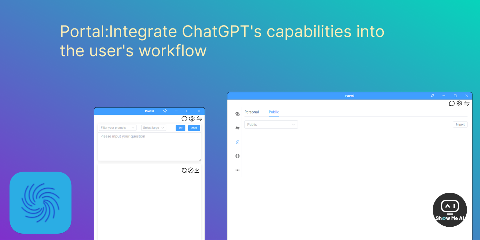 Portal 一个跨平台的客户端,可以接入用户工作流。用户通过快捷键获取高亮文字,复制到 Portal 交由ChatGPT 处理,并提供丰富的提示词模板。