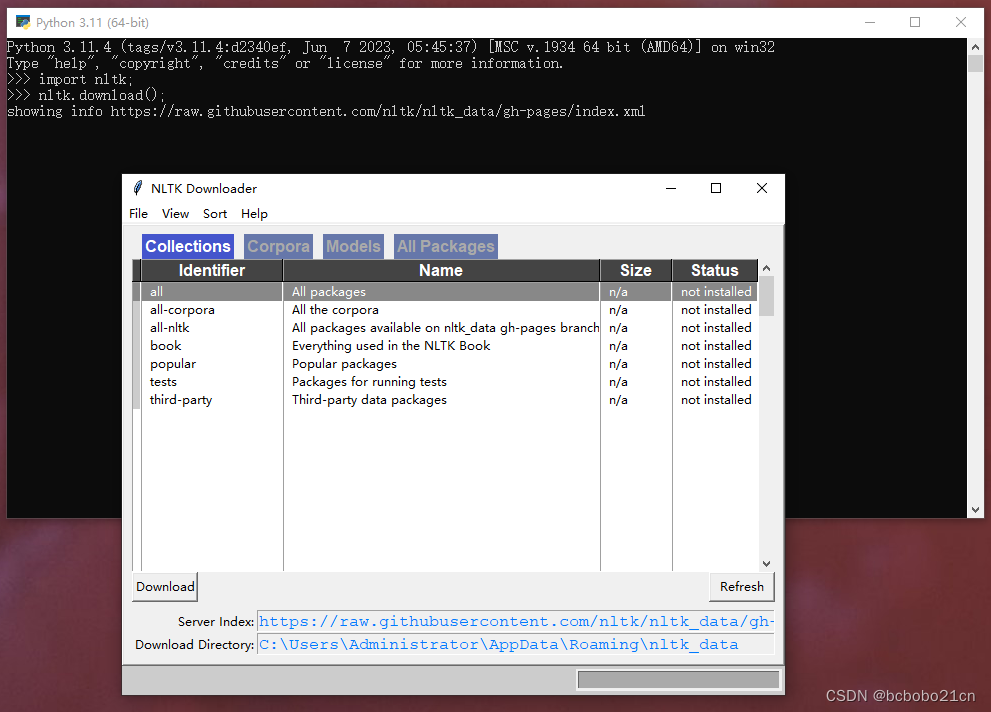 然后进入python,下载nltk的数据包;输入下图语句,弹出一个框,