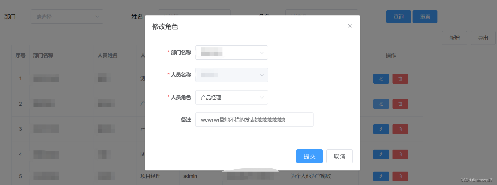 弹框的“新增/修改角色”标题根据states的值来控制,编辑时,“人员名称”处于禁用状态;由于弹框的参数满足不了(少)接口的参数,通过@change="pickDepartment2"事件来操作数据;列表中的操作栏:通过slot-scope="scope"来接收作用域插槽的数据(添加属性slot-scope,并且定义对象scope),scope.row拿到对应行的数据;实现如下需求,点击新增或者行