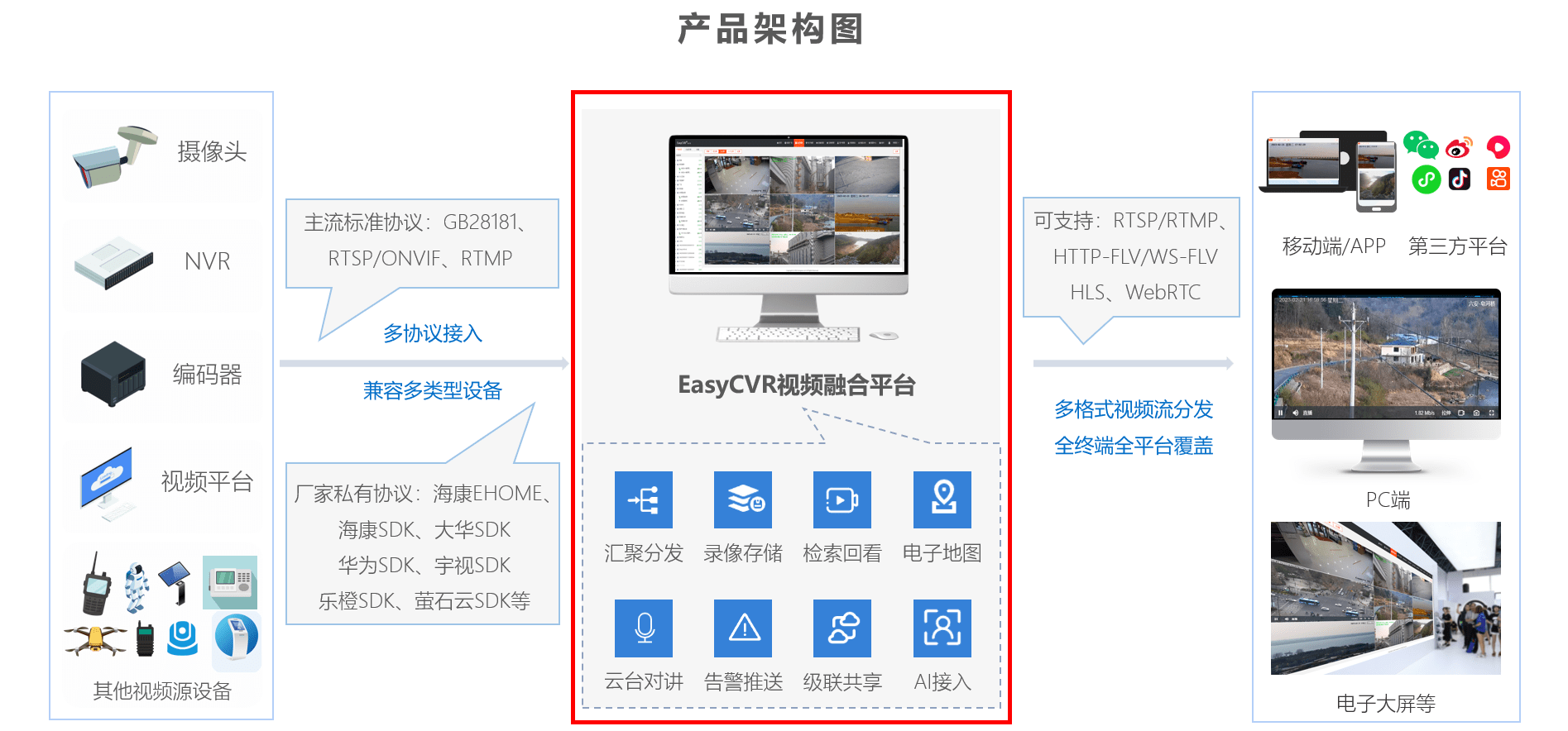 EasyCVR基于云边端一体化架构,支持海量视频汇聚管理,平台支持多协议与多类型设备接入,具体包括国标GB28181、RTMP、RTSP/Onvif、海康Ehome、海康SDK、大华SDK、宇视SDK等,能对外分发RTMP、RTSP、HTTP-FLV、WS-FLV、HLS、WebRTC等。
