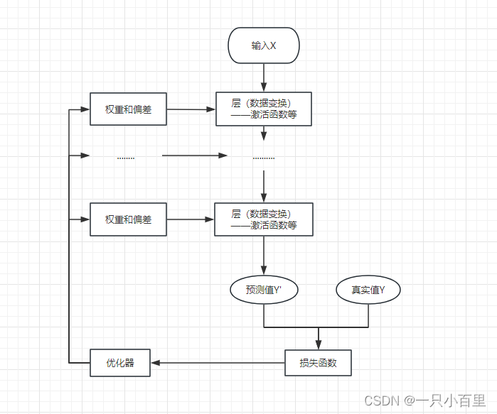 描述:多个层链接在一起构成一个模型或网络,输入数据通过这个模型转换为预测值,然后损失函数把预测值与真实值进行比较,得到损失值(损失值可以是距离、概率值等),该损失值用于衡量预测值与目标结果的匹配或相似程度,优化器利用损失值更新权重参数,从而使损失值越来越小。这是一个循环过程,损失值达到一个阀值或循环次数到达指定次数,循环结束。