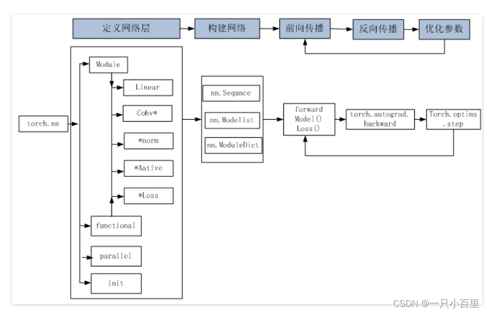 torch.nn模块:提供了构建神经网络所需的各种层和模块,如全连接层、卷积层、池化层、循环神经网络等。