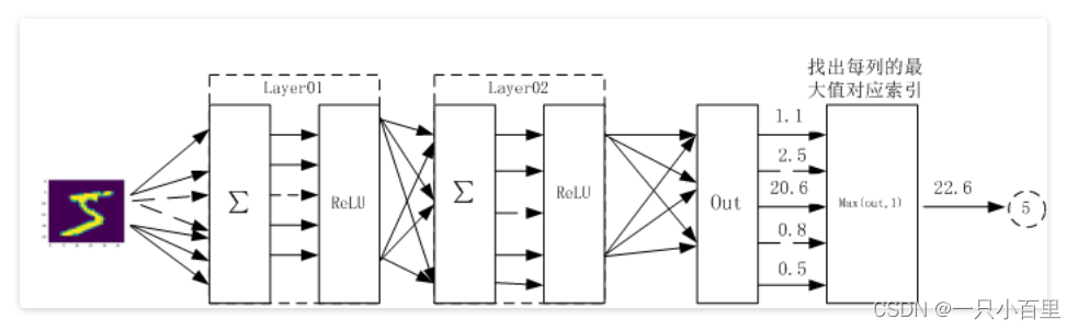 实验中使用两个隐含层,每层激活函数为Relu,最后使用torch.max(out,1)找出张量out最大值对应索引作为预测值。