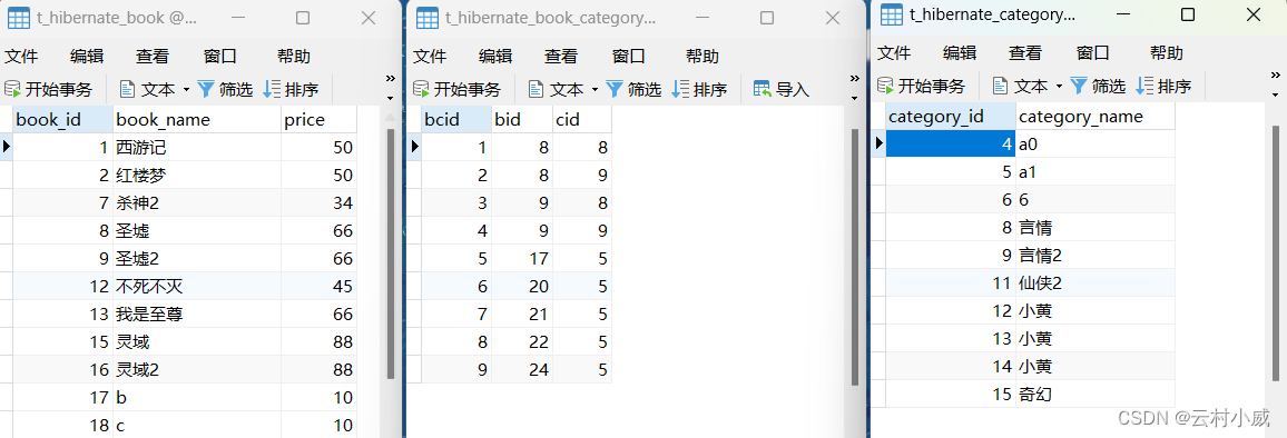 多对多映射是指多个对象与多个对象具有多对多的关系。表之间的多对多关系稍微复杂,需要一个中间表来表示: