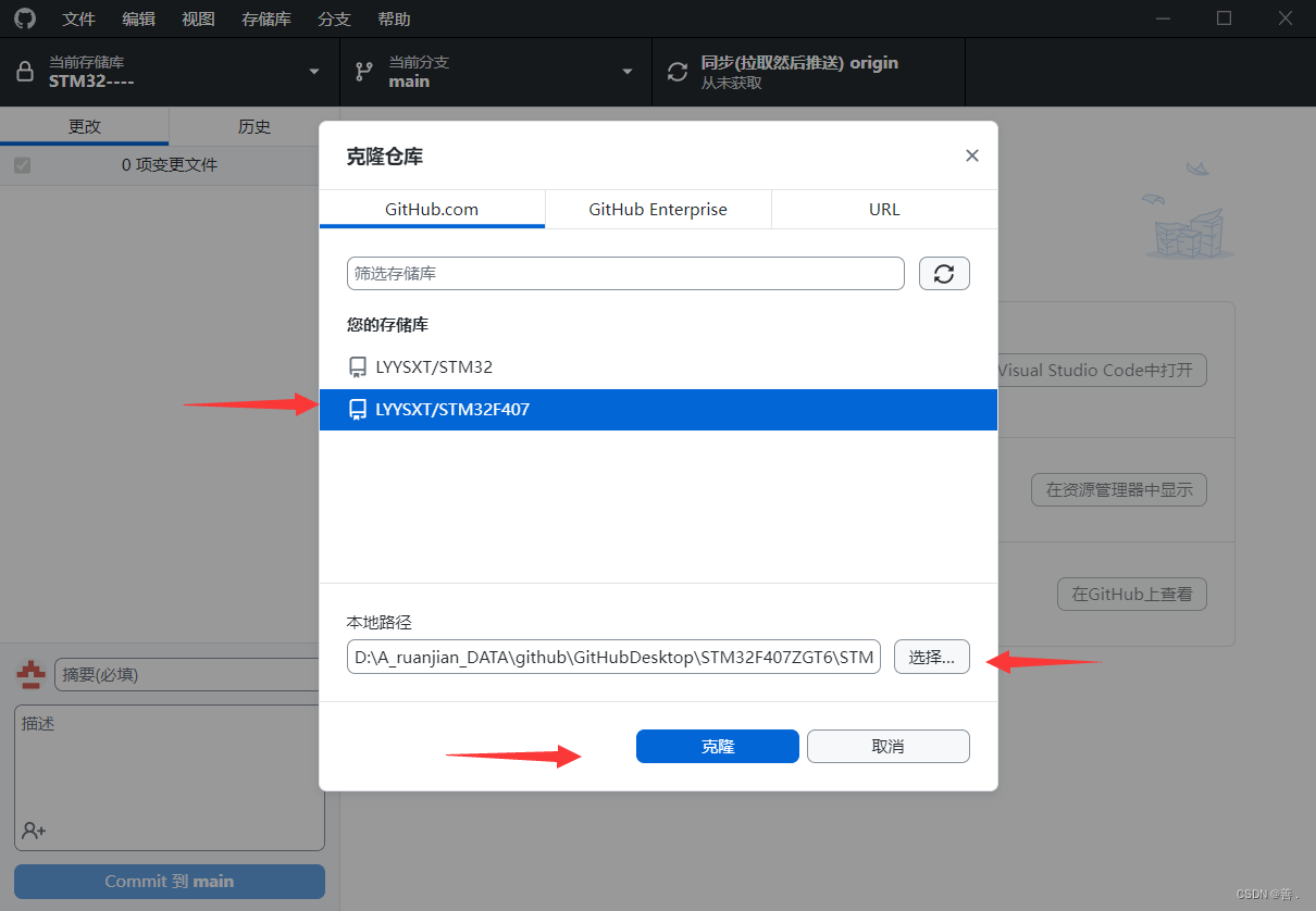 选择好刚才创建的仓库,设置一个路径(之后的项目要复制到该路径里进行上传)