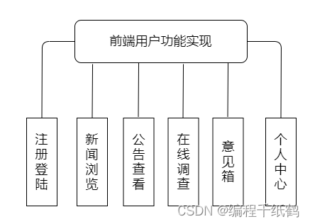 本课题是校园意见箱系统,经过查阅大量的参考文献,参考同类的意见箱系统和调查问卷系统,同时走访高校的学校领导和大量的学生,进行了系统的功能性需求分析。经过分析确定系统的用户主要分为前端使用用户和后台管理用户两类,前端用户的主要功能包含有:用户在线注册与登陆、平台发布的新闻的信息浏览、公告信息的查看、调查问卷的参与、在线意见的提交、在线互动交流的实现以及个人中心管理。具体的系统功能结构图如下图3.1所示: