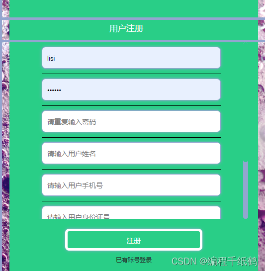 前端用户进入校园意见箱平台后可以在线进行注册,填写相关信息后提交到服务器平台,系统基于前后端分离的模式开发实现,前端用户的数据通过异步请求以JSON的数据格式传输到服务器,服务器接受数据后进行解析,然后使用Mybatis-plus框架的保存方法将数据保存至数据库表 yonghu 表中,下面展示用户注册的基本界面,如图3.1所示: