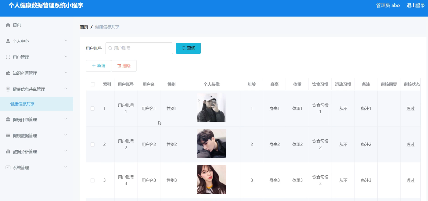 系统管理员可以查看健康信息共享,并且可以对健康信息共享管理的信息进行添加修改删除操作。界面如下图所示:
