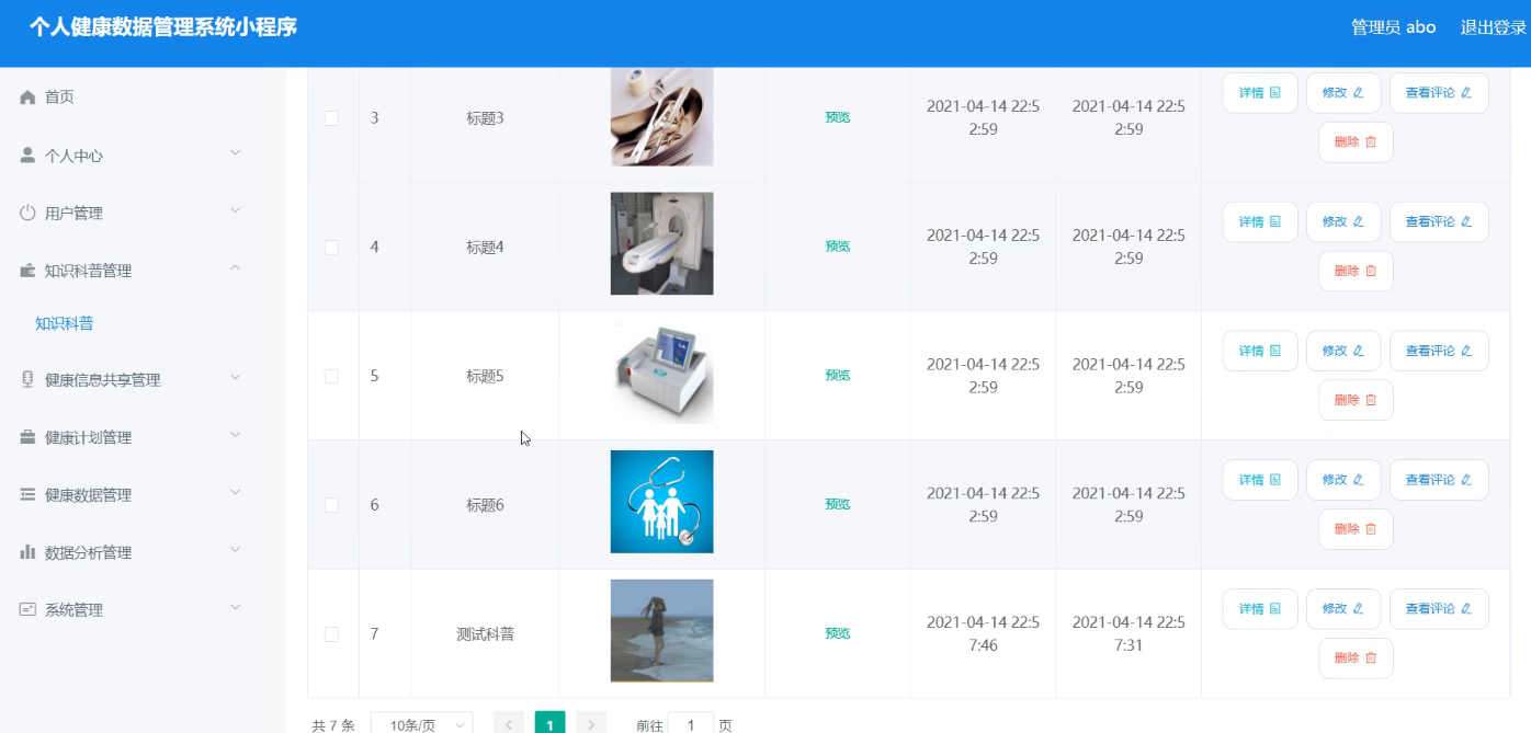 管理员可以对知识科普信息进行添加,修改删除查询操作。具体界面如图5.2所示。