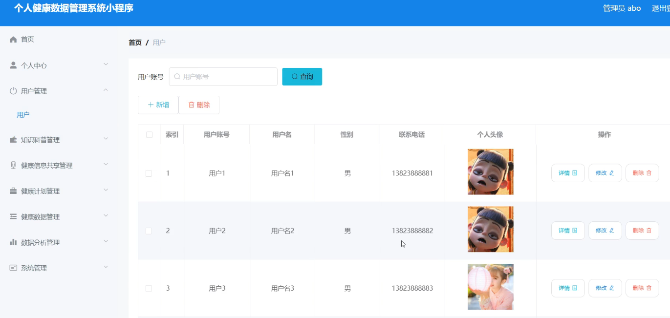 管理员可以管理用户信息,可以对通过微信小程序端注册的用户信息修改删除。具体界面的展示如图5.1所示。