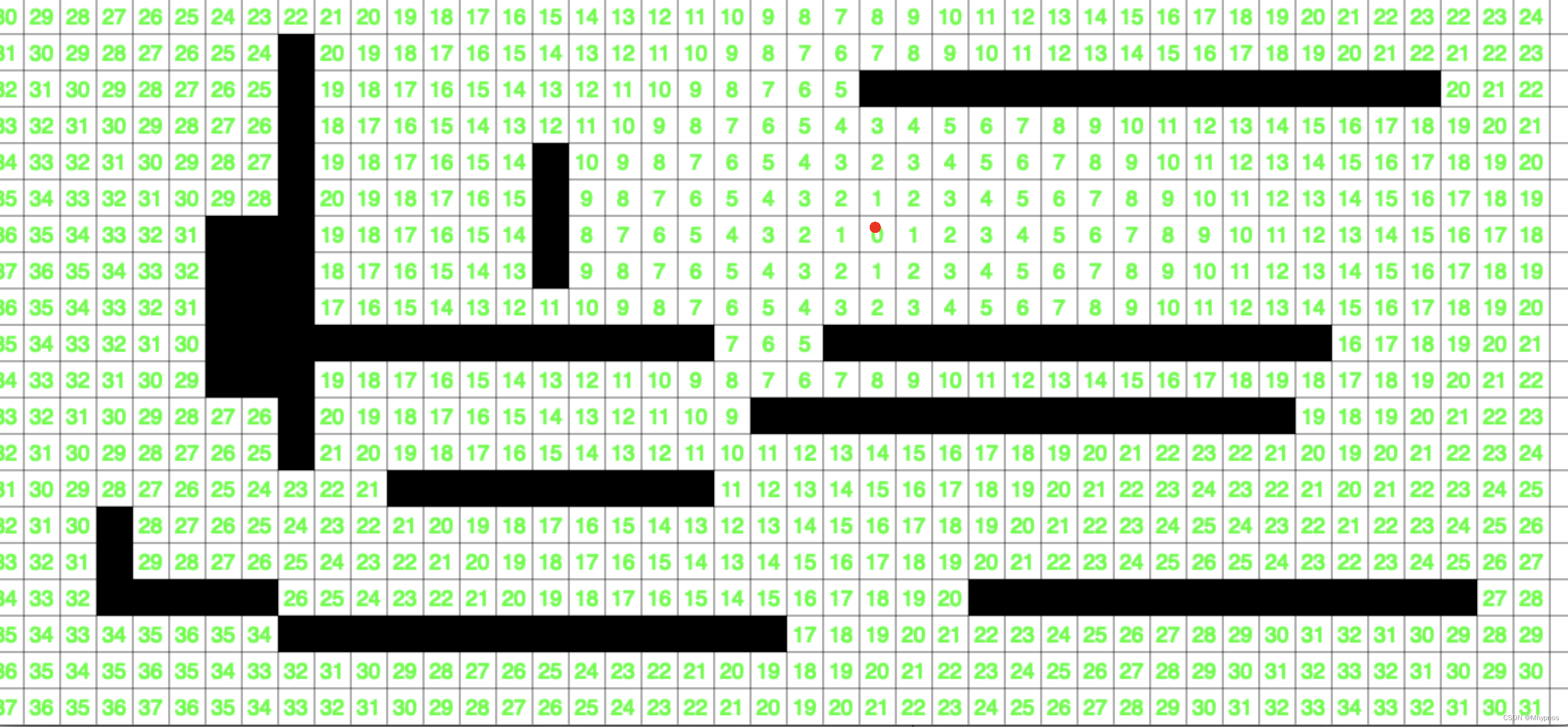 计算所有网格对于目标点(图中红点)网格的路径距离。(每个格子的移动距离算作1)。