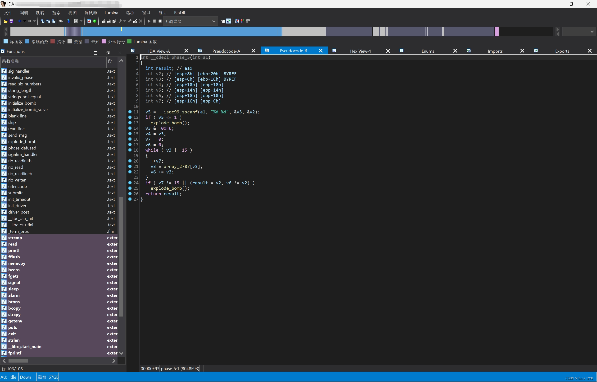 对于某些架构(如x86),IDA Pro包含了高度优化的反编译器,可以生成类似高级语言的伪代码,极大地简化了逆向工程的过程。这样实验某种程度上就变成了C语言程序阅读题。
