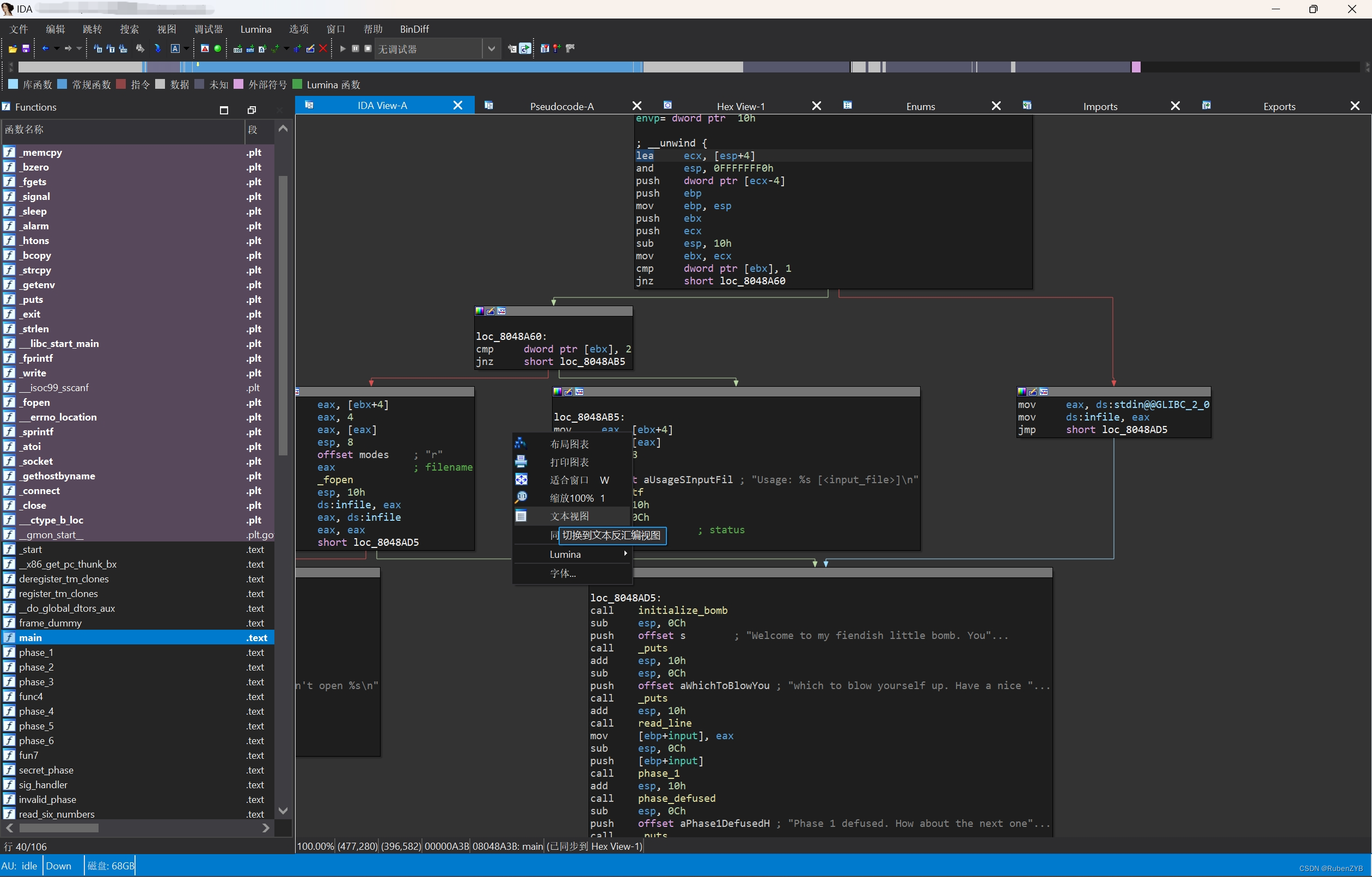 左边的“函数名称”那栏可以双击选择想要查看的函数 ,右键选择文本视图可以以文本形式而不是图表形式查看反汇编代码。