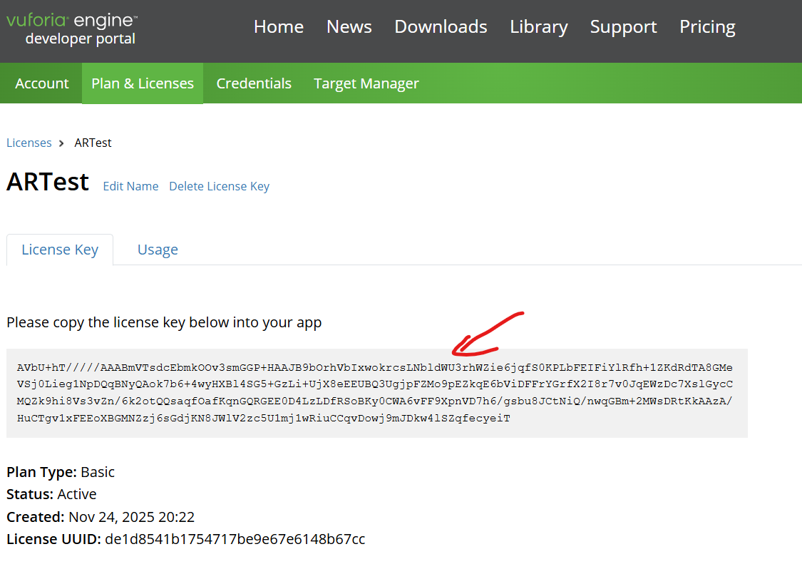 点击打开如下网页登录后下载SDK for unity在My Account>Licenses 页面获取一个License,点击 “Get Basic” 按钮输入License名字,例如 “ARLesson”,再点击 “Confirm”按键查看License内容点击上面列表中的license名字 “ARLesson”,查看内容,下面箭头中的license key内容可以先复制再粘贴到一个新建的文本中