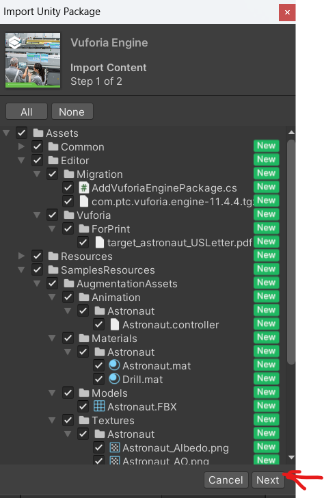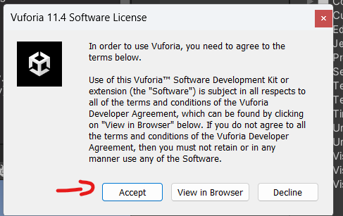 导入过程中提示要 Accept (接受) Vuforia 11.4 Sosftware License