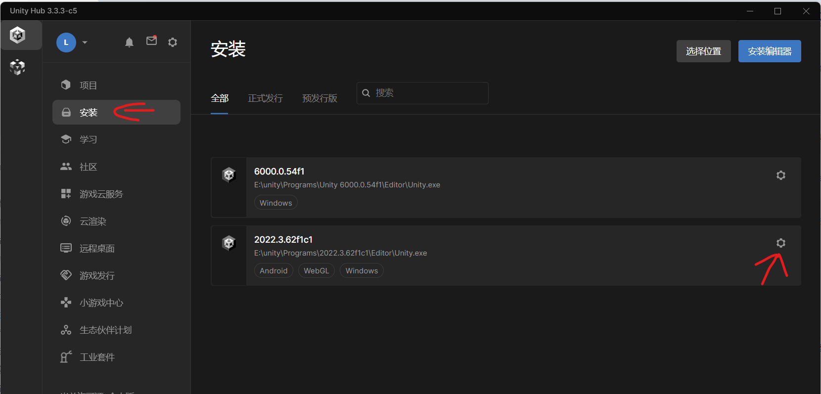 在 Unity Hub中点击左侧Installs(安装),在右侧已经安装的Unity Editor的右上角,点击后弹出的菜单中选择Add Modules,然后在弹出窗口中选择 Android Build Support, 然后 Continue,完成安装Android 平台。(如果Android Build Support已经安装了,这步不需要了)