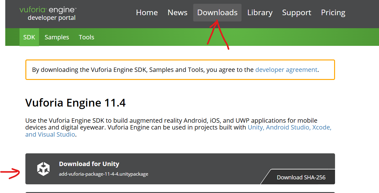 登录后下载SDK for unity (该SDK在unity 资源商店也有下载 vuforia asset in unity)