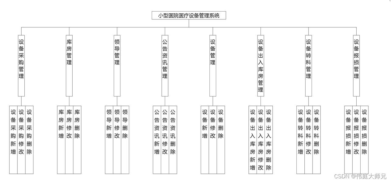 在前面分析的管理员功能的基础上,进行接下来的设计工作,最终展示设计的管理员结构图(见下图)。管理员增删改查设备信息: