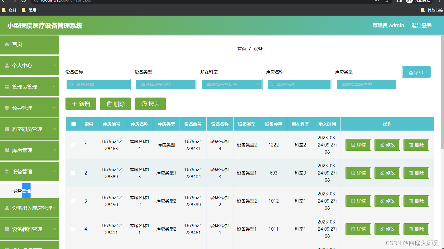 如图5.3显示的就是库房信息管理页面,此页面提供给管理员的功能有:根据库房信息进行条件查询,还可以对库房信息进行新增、修改、查询操作等等。