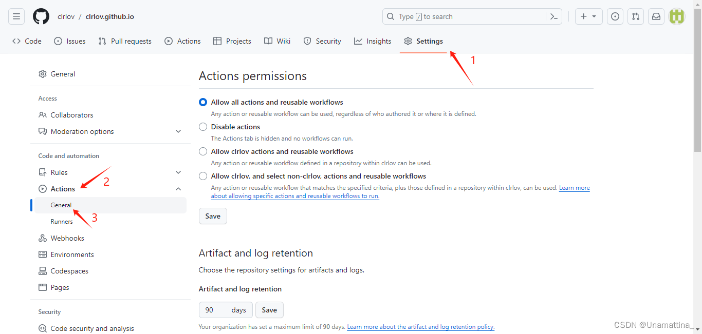 在Setting标签页中,侧边栏中选择Pages,Source 选择 "Deploy from a branch",然后在 Branch 标签下选择 gh-pages 分支和 /(root) 目录,点"Save"保存