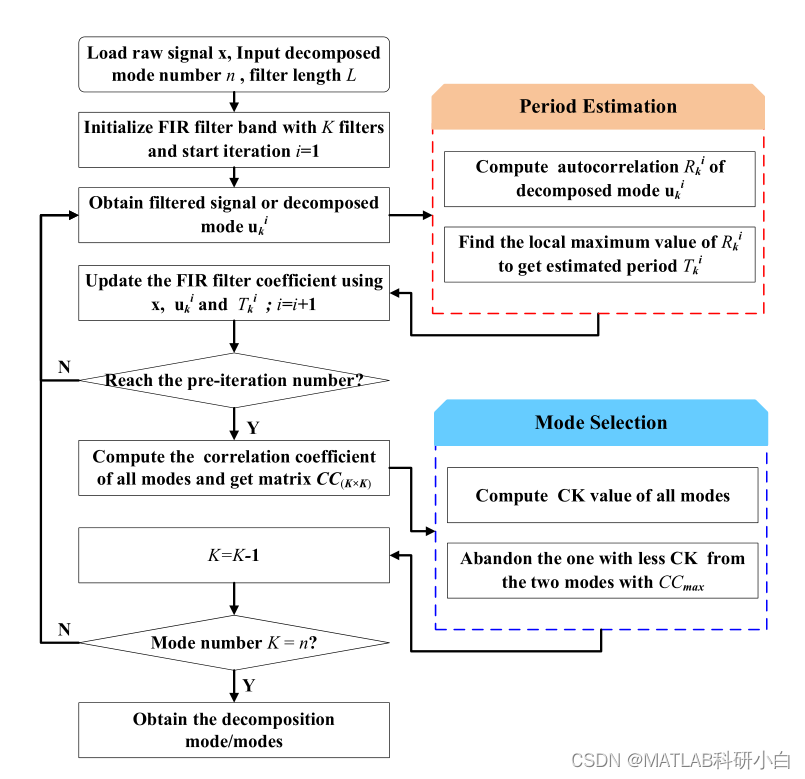 (6)计算每两个模态的构造一个KxK矩阵CC(KxK)。锁定CC值最大的两个模式CCmax,并使用估计的周期计算 它们的CK。然后,从两种模式中抛弃CK较小的模式,设K=K-1。