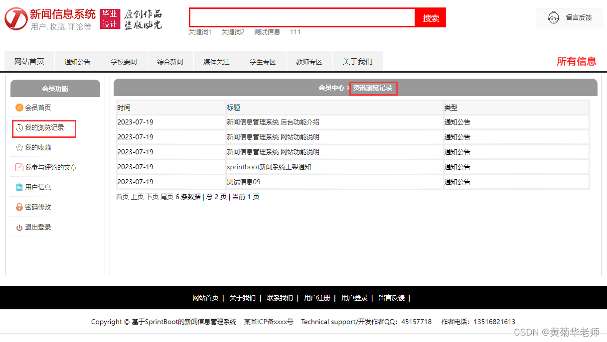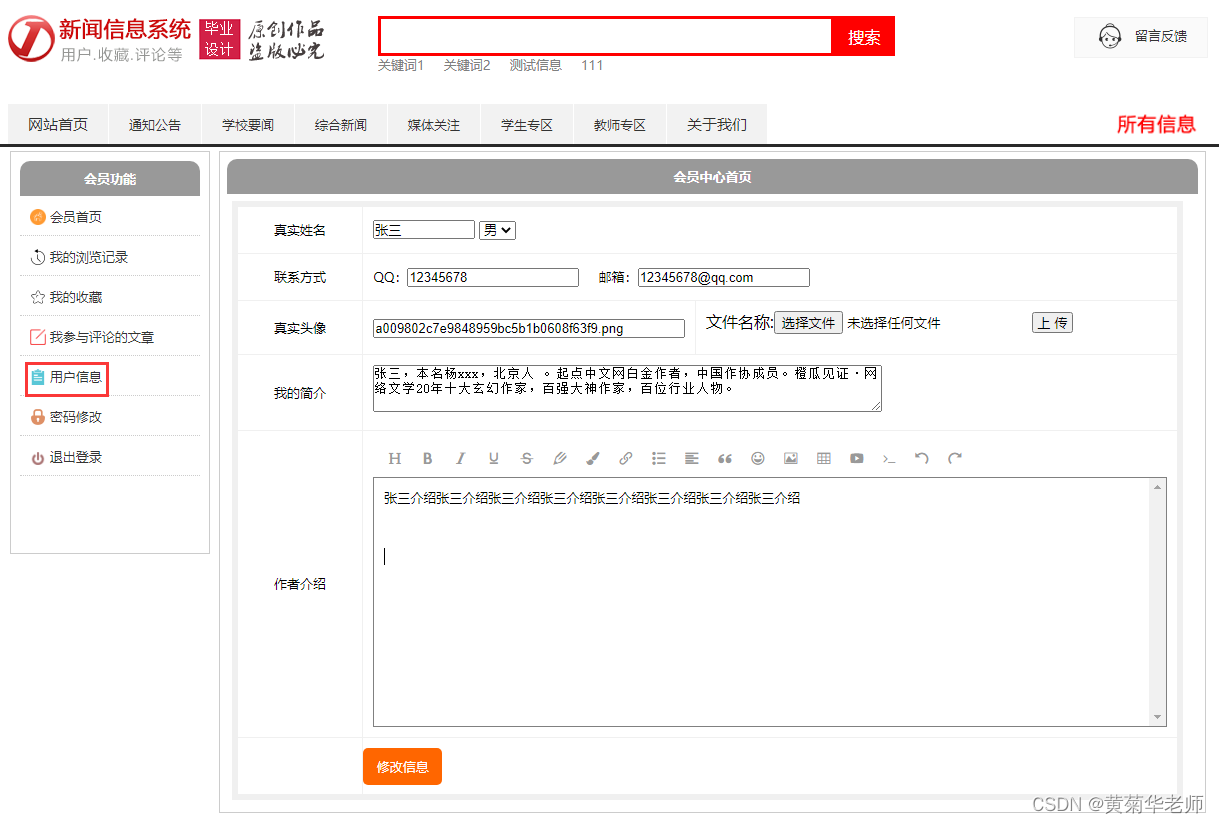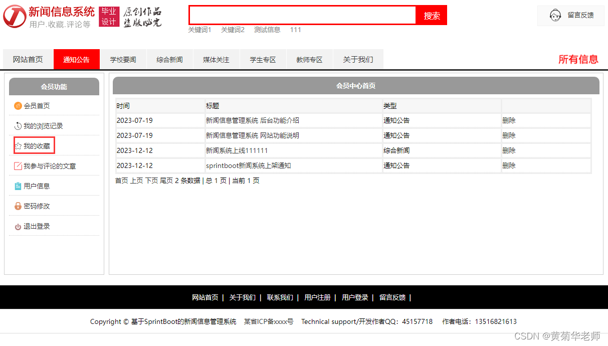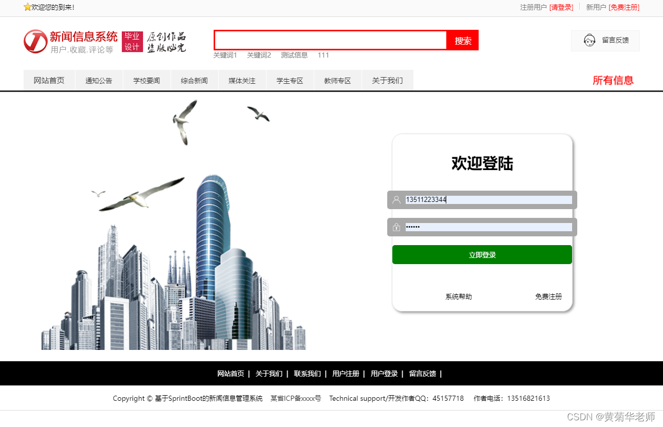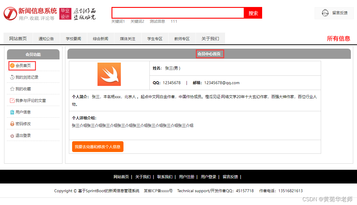 基于Springboot框架新闻信息管理系统设计与实现毕业设计源代码,黄菊华老师《Vue.js入门与商城开发实战》《微信小程序商城开发》图书作者,CSDN博客专家,在线教育专家,CSDN钻石讲师;专注大学生毕业设计教育和辅导。所有项目都配有从入门到精通的基础知识视频课程,学习后应对毕业设计答辩。项目配有对应开发文档、开题报告、任务书、PPT、论文模版等项目都录了发布和功能操作演示视频;项目的界面和