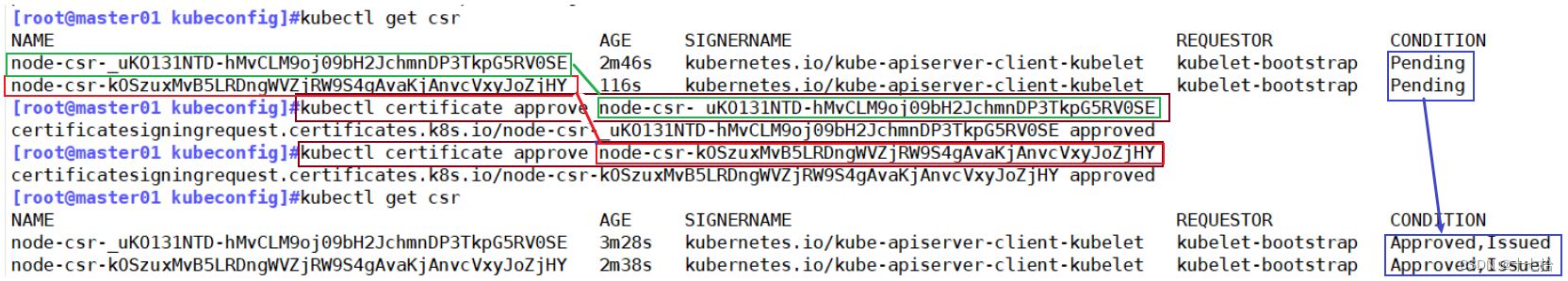 [rootemaster01 kubeconfig]#kubectl certificate approve <复制对应的NAME>