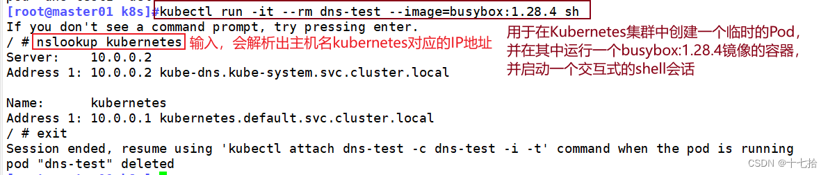 [root@master01 k8s]#kubectl run -it --rm dns-test --image=busybox:1.28.4 sh