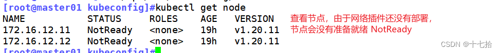 #查看节点,由于网络插件还没有部署,节点会没有准备就绪 NotReady