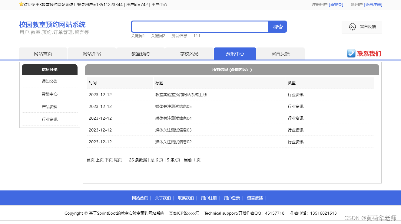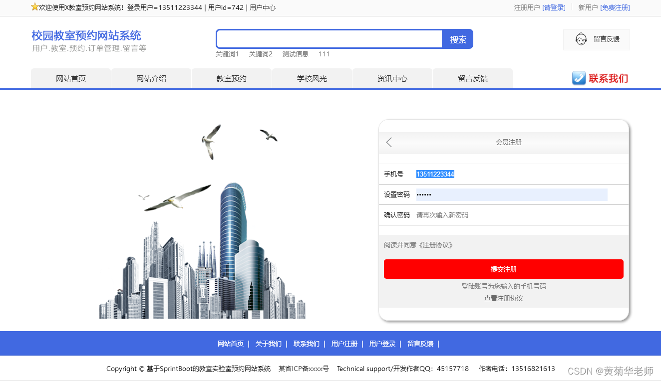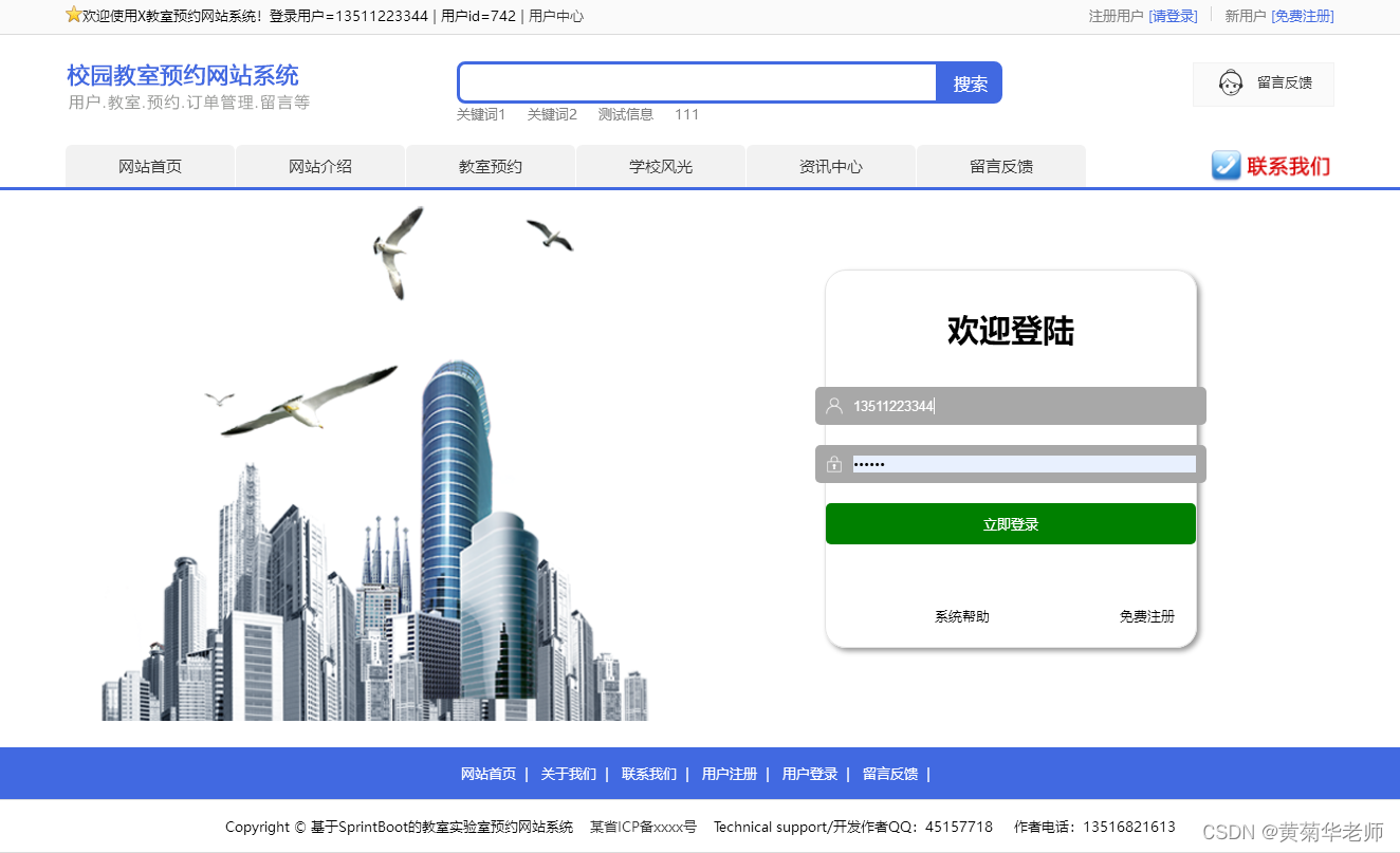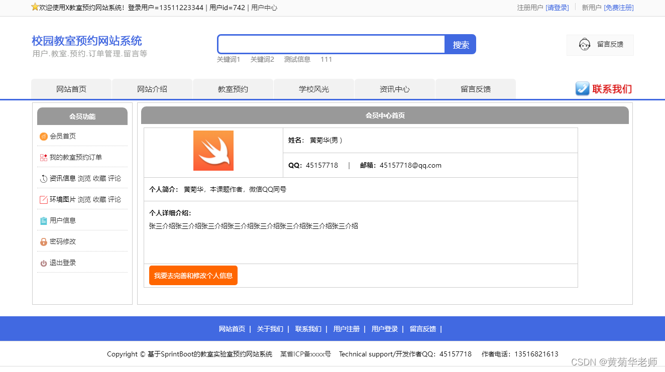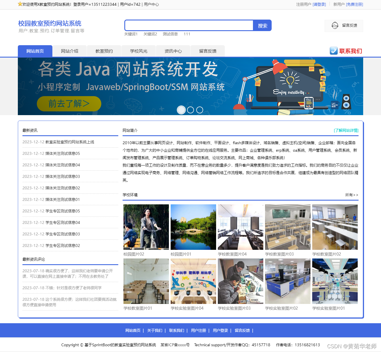 基于Web校园教室预约管理系统设计与实现毕设成品源代码,黄菊华老师《Vue.js入门与商城开发实战》《微信小程序商城开发》图书作者,CSDN博客专家,在线教育专家,CSDN钻石讲师;专注大学生毕业设计教育和辅导。所有项目都配有从入门到精通的基础知识视频课程,学习后应对毕业设计答辩。项目配有对应开发文档、开题报告、任务书、PPT、论文模版等项目都录了发布和功能操作演示视频;项目的界面和功能都可以定制