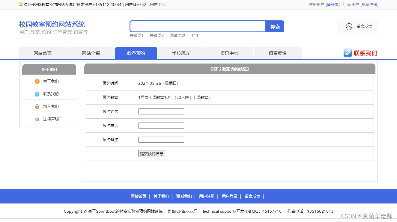 教室预约:在教室列表,点击具体的某个教室,进入,确认预约日期和教室,填写预约客户的姓名、电话、备注,然后提交预约信息。