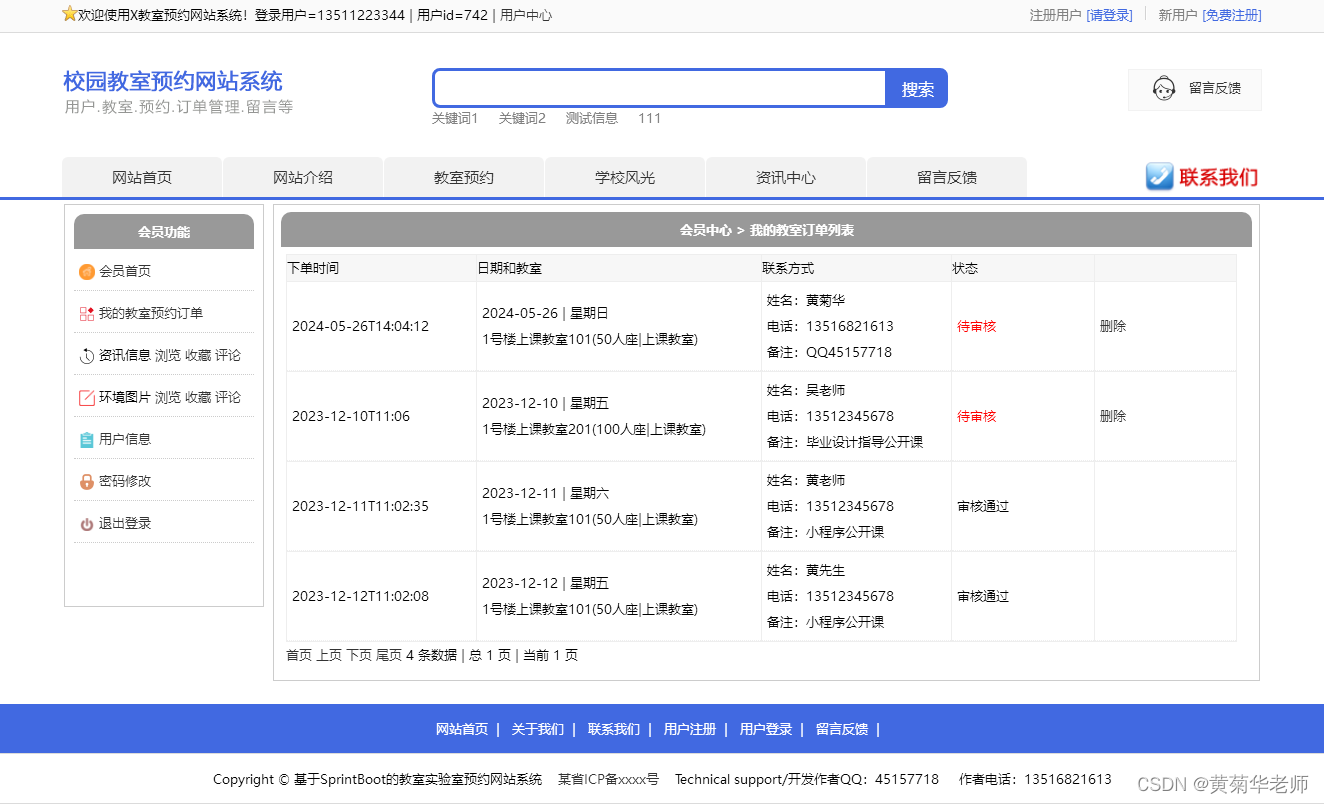 我的教室预约订单:显示已经预约的教室订单信息,包含教室信息、预约日期,客户姓名、电话、备注。