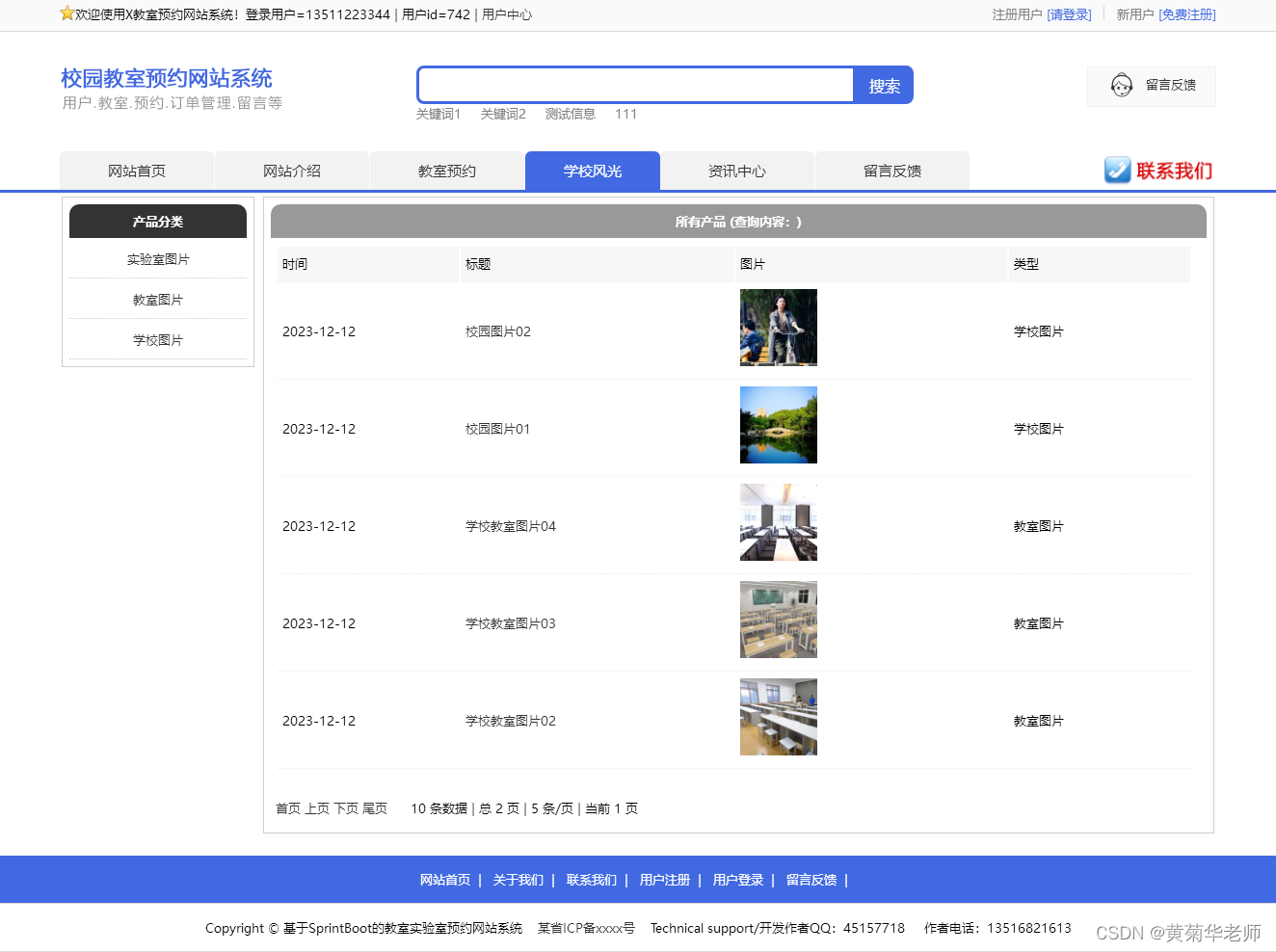 学校风光(环境图片):显示所有教室的图片介绍信息,左侧是分类,右侧显示对应分类的教室图片,默认显示全部