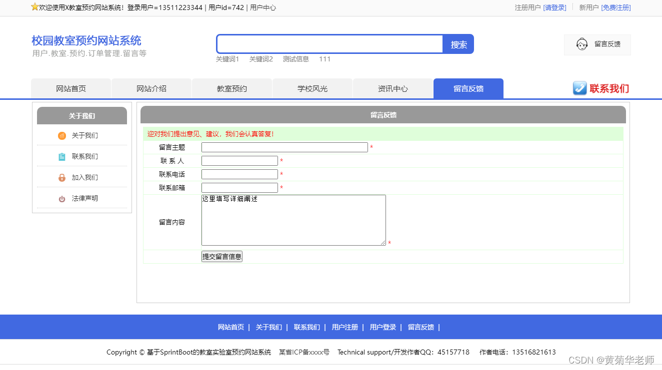 留言反馈:用户填写李哭咽的主题、联系人、电话、邮箱、留言内容;后台管理可以查看留言列表,可以删除留言。。