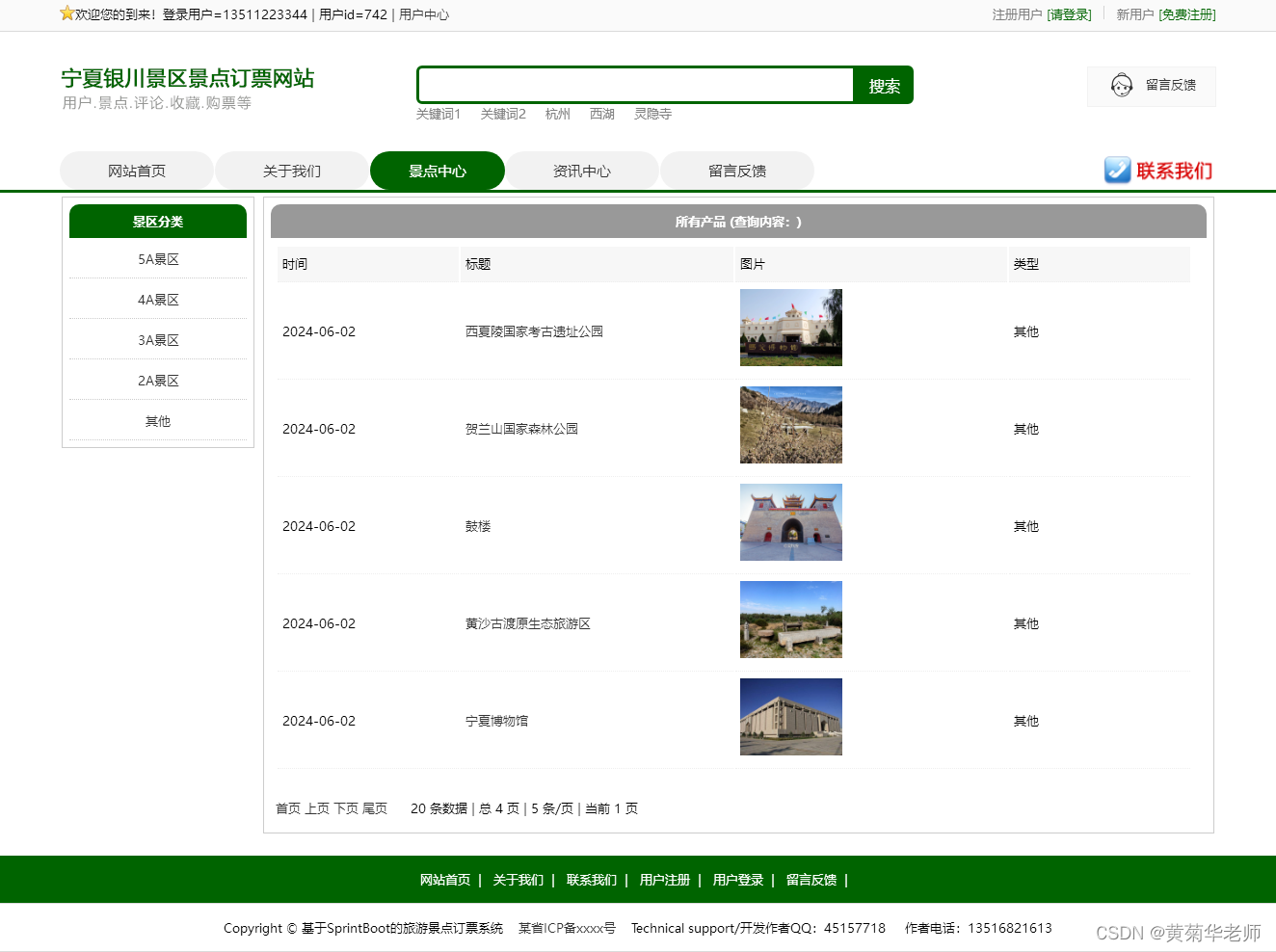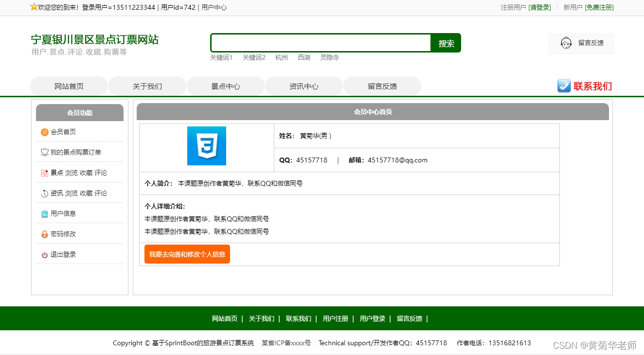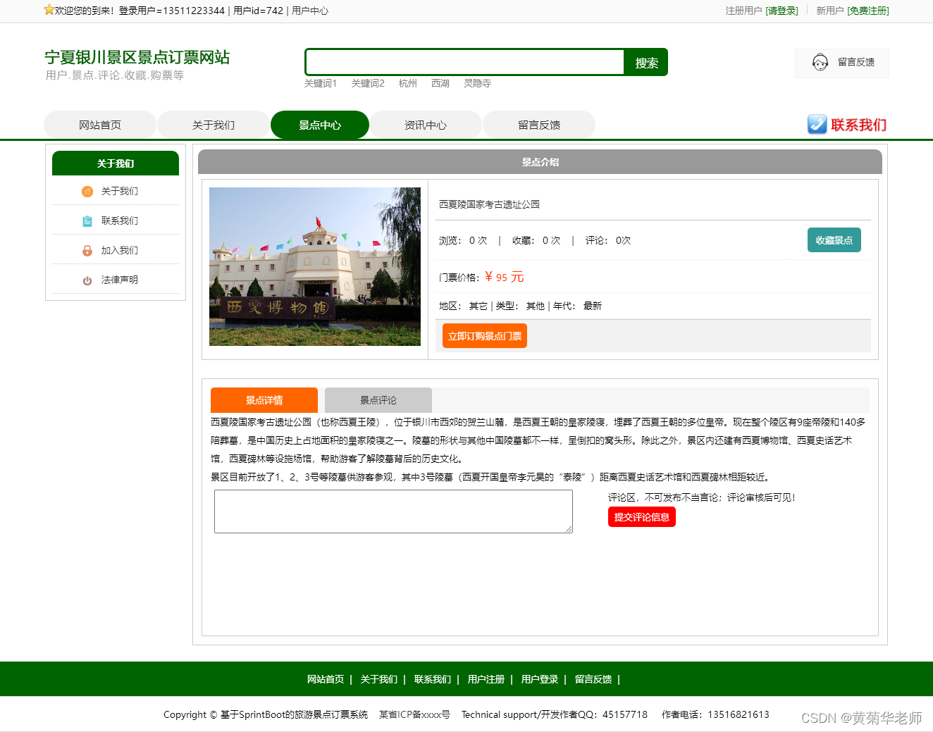 基于web宁夏银川景点购票系统毕业设计成品源码,黄菊华老师《Vue.js入门与商城开发实战》《微信小程序商城开发》图书作者,CSDN博客专家,在线教育专家,CSDN钻石讲师;专注大学生毕业设计教育和辅导。所有项目都配有从入门到精通的基础知识视频课程,学习后应对毕业设计答辩。项目配有对应开发文档、开题报告、任务书、PPT、论文模版等项目都录了发布和功能操作演示视频;项目的界面和功能都可以定制,包安装