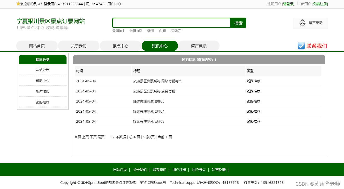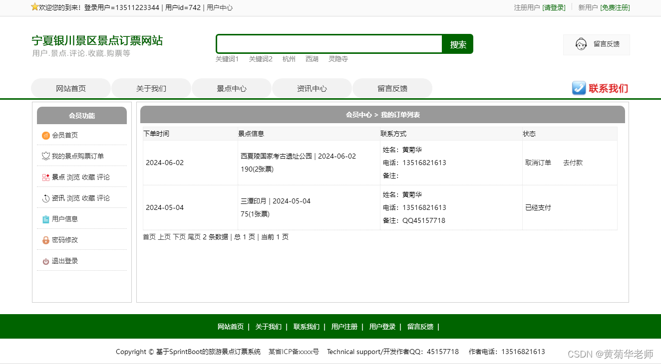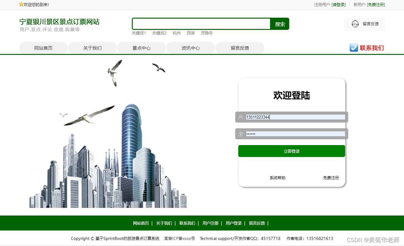 基于web宁夏银川景点购票系统毕业设计成品源码,黄菊华老师《Vue.js入门与商城开发实战》《微信小程序商城开发》图书作者,CSDN博客专家,在线教育专家,CSDN钻石讲师;专注大学生毕业设计教育和辅导。所有项目都配有从入门到精通的基础知识视频课程,学习后应对毕业设计答辩。项目配有对应开发文档、开题报告、任务书、PPT、论文模版等项目都录了发布和功能操作演示视频;项目的界面和功能都可以定制,包安装
