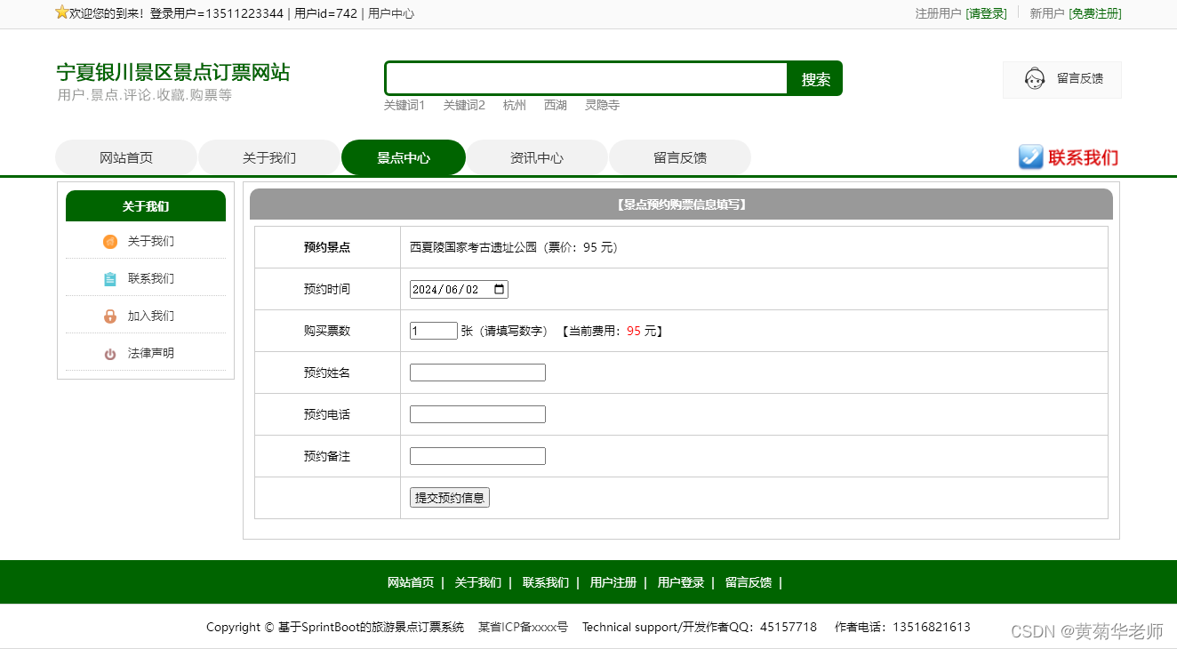 景点订票:在景点详情页面,点击“立即订购景点门票”,确认景点的信息和门票费用;填写预约的姓名、电话、备注,提交门票订单。