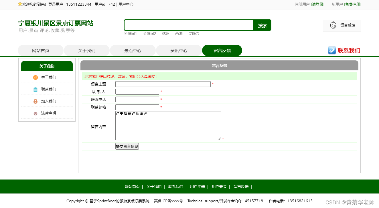 留言反馈:用户填写李哭咽的主题、联系人、电话、邮箱、留言内容;后台管理可以查看留言列表,可以删除留言。