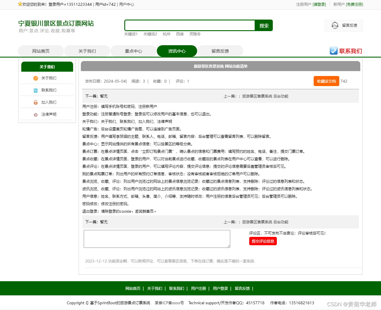景点评论:在景点详情页面,登录的用户,可以填写评论内容,提交评论信息;提交的评论信息需要后盖管理员审核后可见。