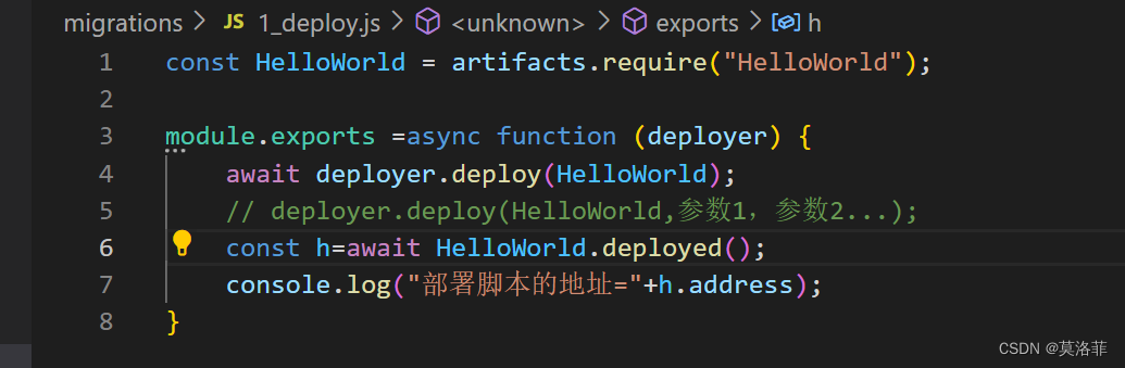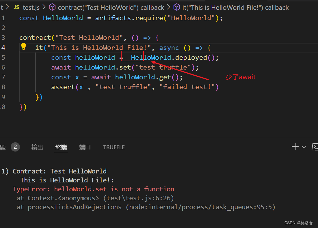 3.像下方await 表名他是一个异步操作,返回一个promise对象,以及我们调用合约中的函数,在js测试文件都是异步操作,函数 加async 关键字, await修饰。
