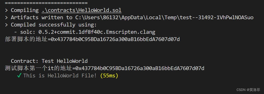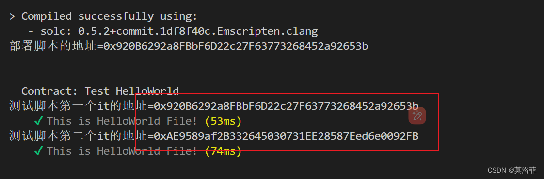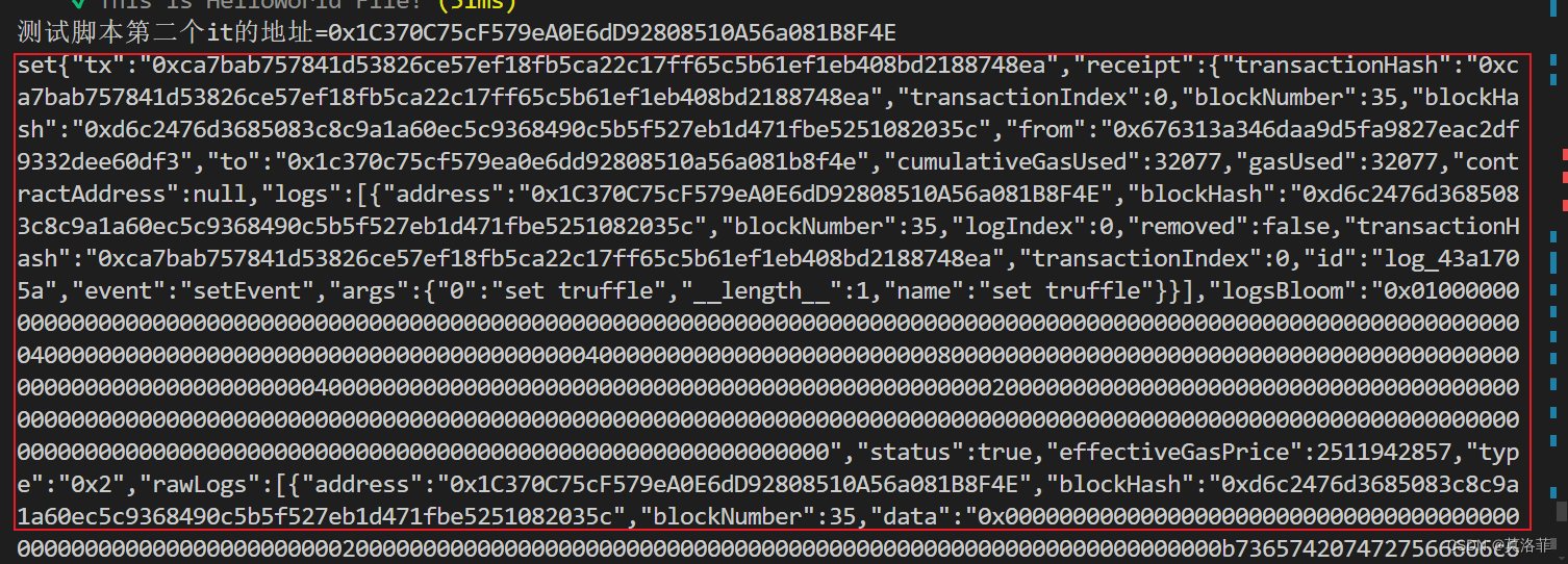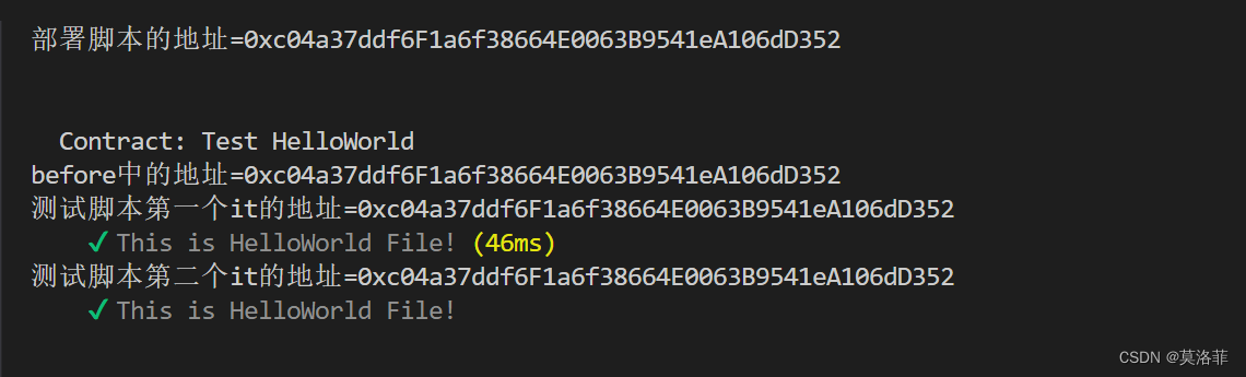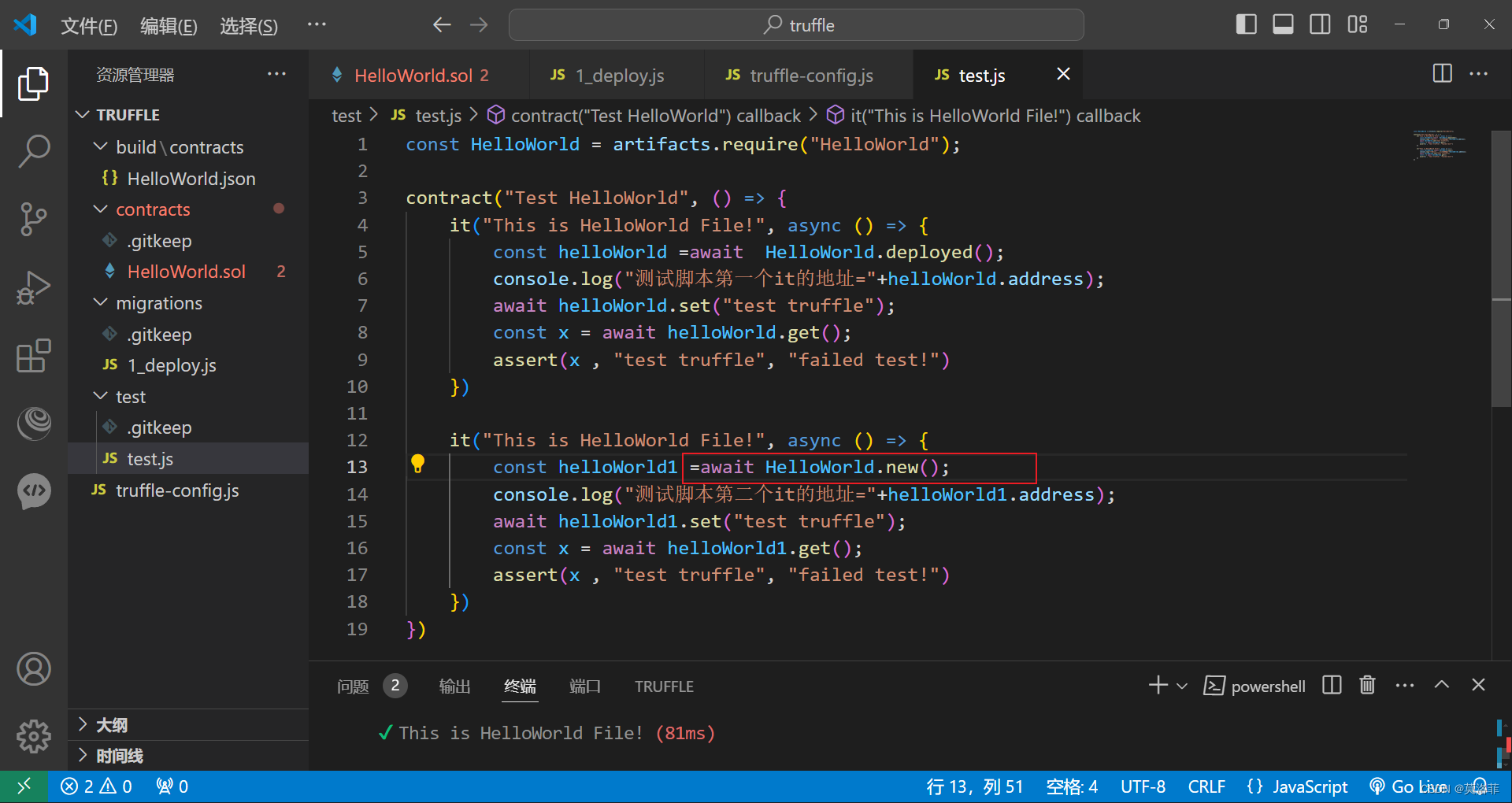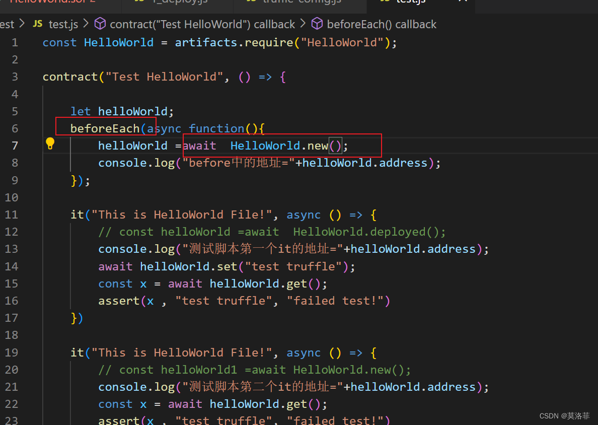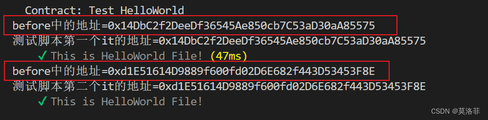 上面我们知道可以通过deployed获取以及部署到链上的合约,那么如何不通过第二步部署合约直接在测试脚本里测试合约呢,就可以通过new来创建一个合约实例。我们定义一个let 变量,然后通过before来在所有的it测试之间将合约拉下来,保存到helloWorld变量中,后续的it测试就直接使用这个实例。我们可以发现地址不一样了,说明我们new出来的是个新的实例对象,那由于我们是不同的对象,我们的数